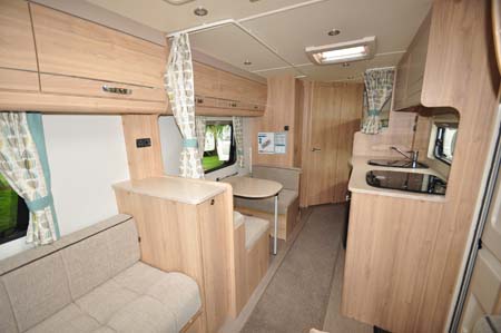 This, the slightly pricier 586 – the similarly bunk bedded 526 is £200 less – majors on a bigger washroom at the back, whilst also extending Elddis’s claims to offering more family layouts than any other manufacturer.