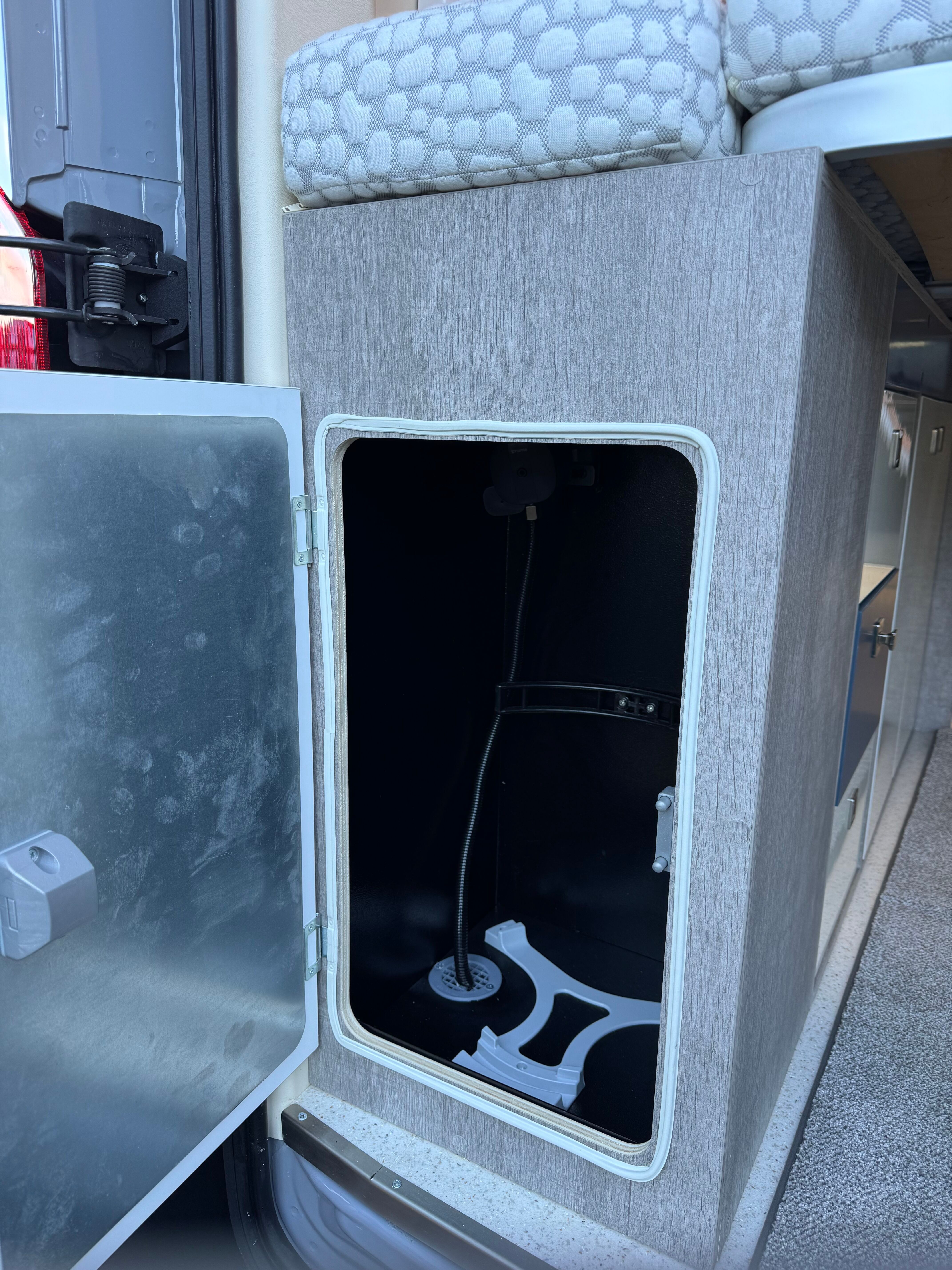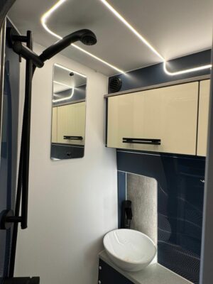 A 12V extractor fan takes care of ventilation. As well as two lockers and some neat open shelving in here, there are a couple of hooks, towel holder, even a small mirror.