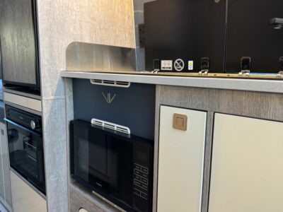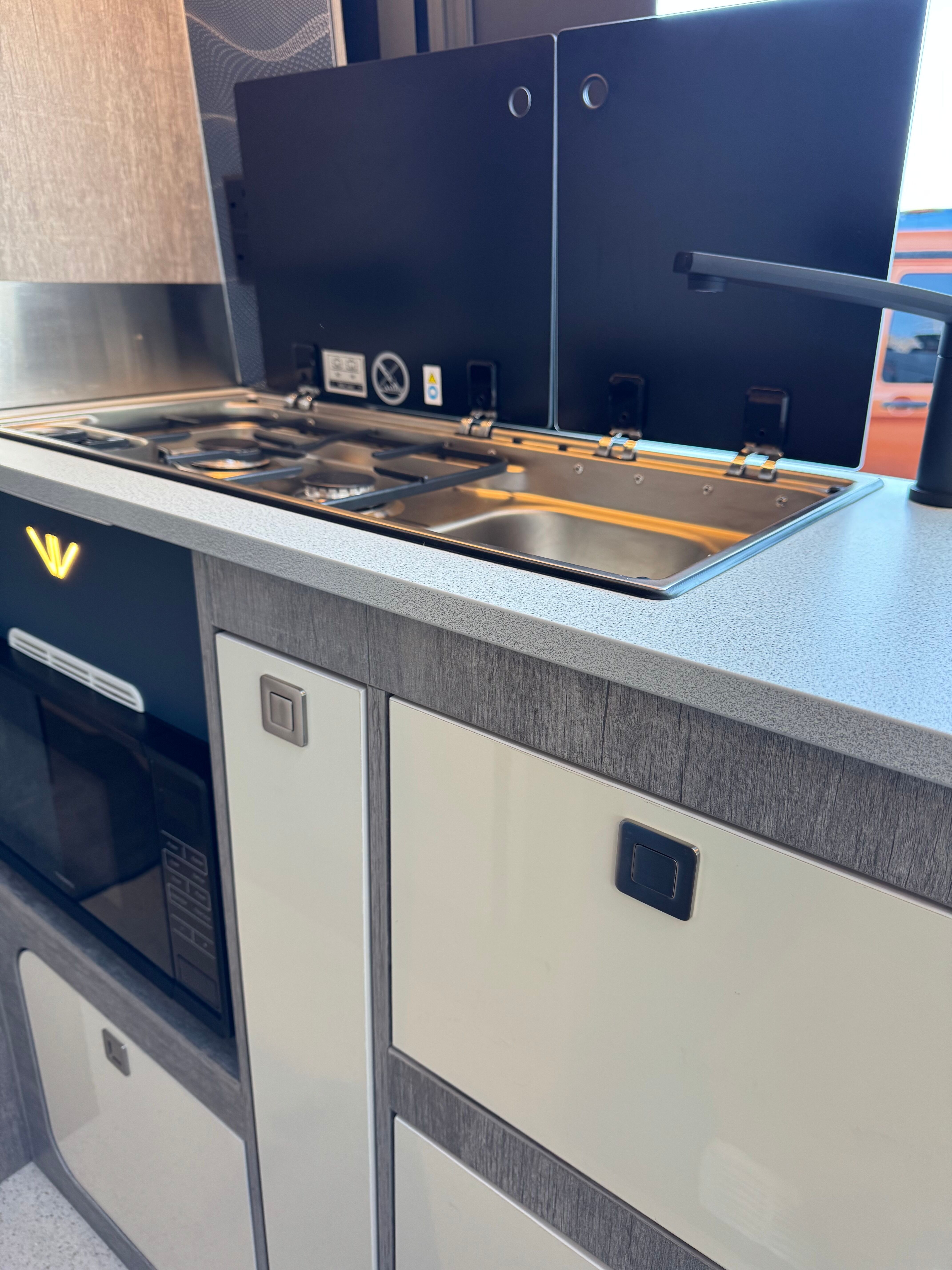 Kitchen facilities in the WildAx Equinox are generous considering this is a van conversion – not only is there a two-burner hob and sink combination in stainless steel, you also get a grill/oven and a microwave.