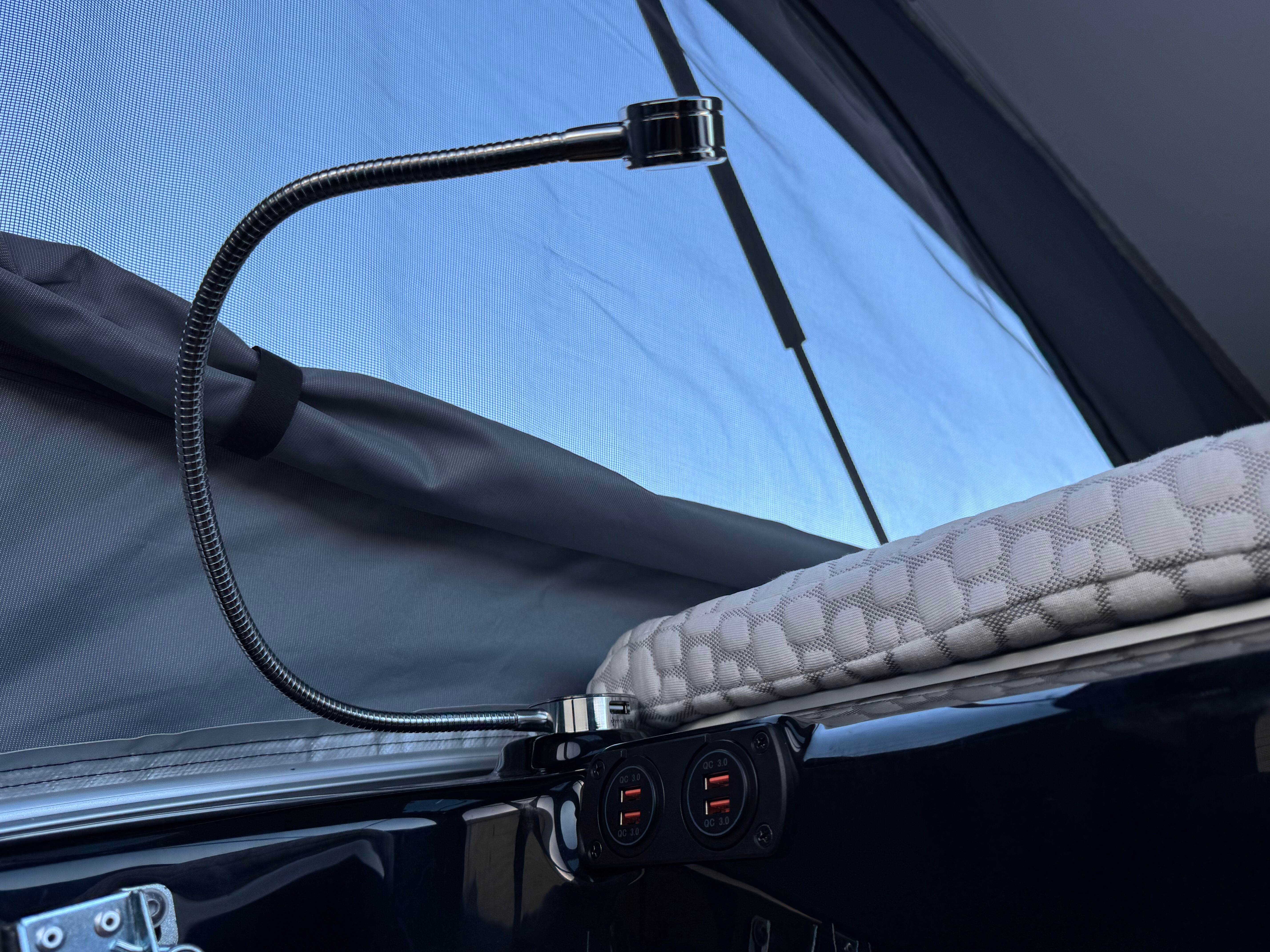 There’s also the double bed in the elevating roof section. It’s some 2.00m x 1.20m, accompanied by twin reading lights, USB charging points, as well as a rooflight.