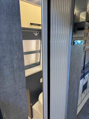 Opposite the kitchen a space-efficient sliding tambour door gives easy access to the washroom, where there’s a swivel-bowl toilet (also from Freucamp), countertop handbasin and space to shower.