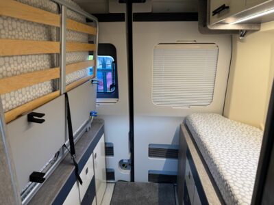 The kitchen is across the nearside, encroaching partway across the sliding door access (as is typical for conversions like this), where there’s also an electric slide-out step and full flyscreen.