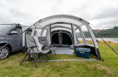 This inflatable porch awning is now in its third season – and going strong. It’s also particularly easy to pitch as well as being light in weight (12.7kg all-in). Pack size is also a pretty compact 75cm x 39cm x 36.5cm.